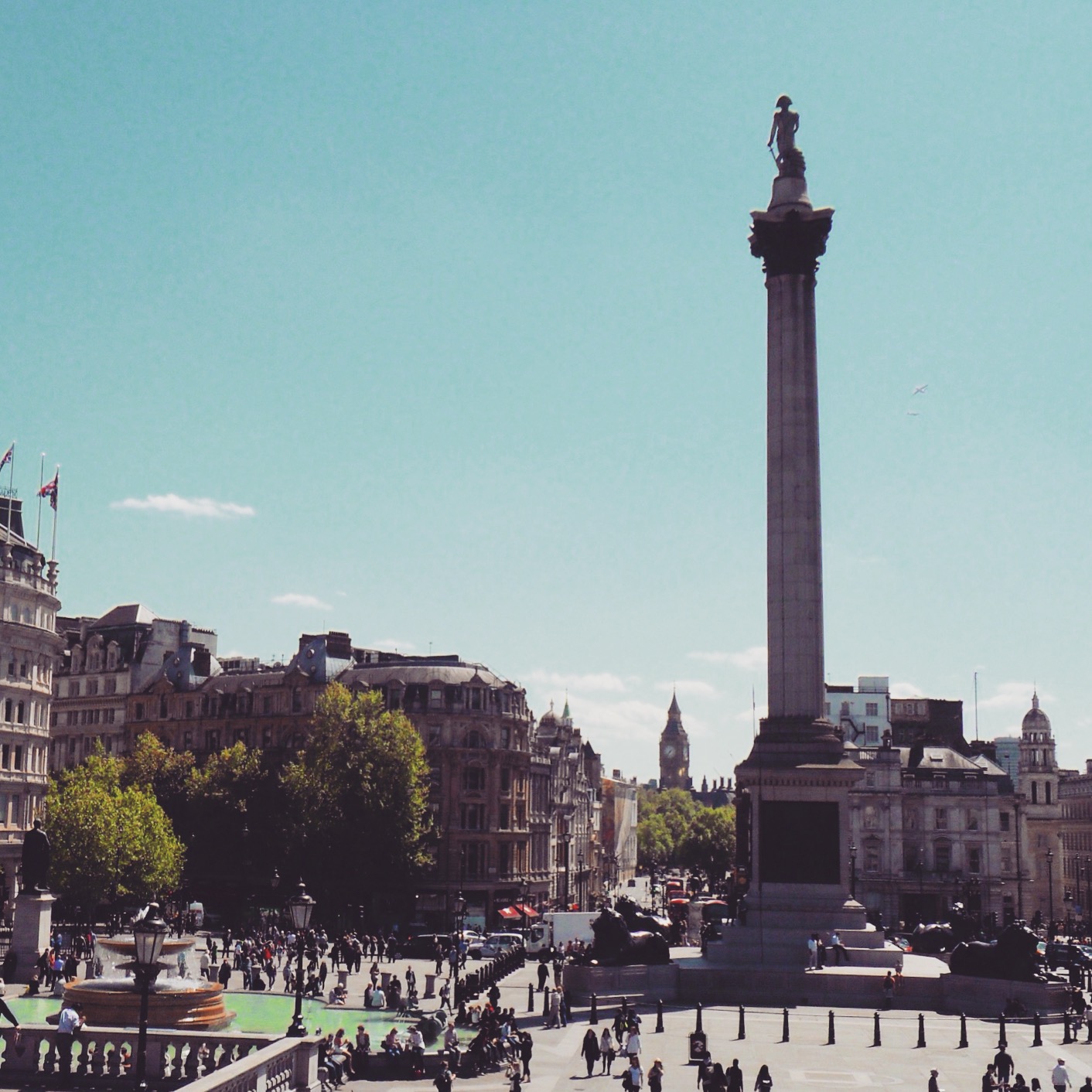 After a morning spent wandering around the canals of Little Venice where Natalia lives, smelling the smells of Camden market, and a pleasant walk through St James Park, I stumbled upon Trafalgar Square. Lucky for me, I managed to enter the National Gallery 30 minutes before closing and wandered around the impressionist exhibit for a few minutes, admiring the rosy views of the country I had just left. From the balcony of the National Gallery I saw that icon of the London skyline, Big Ben framed by Nelson’s Column. Sweet photo op.